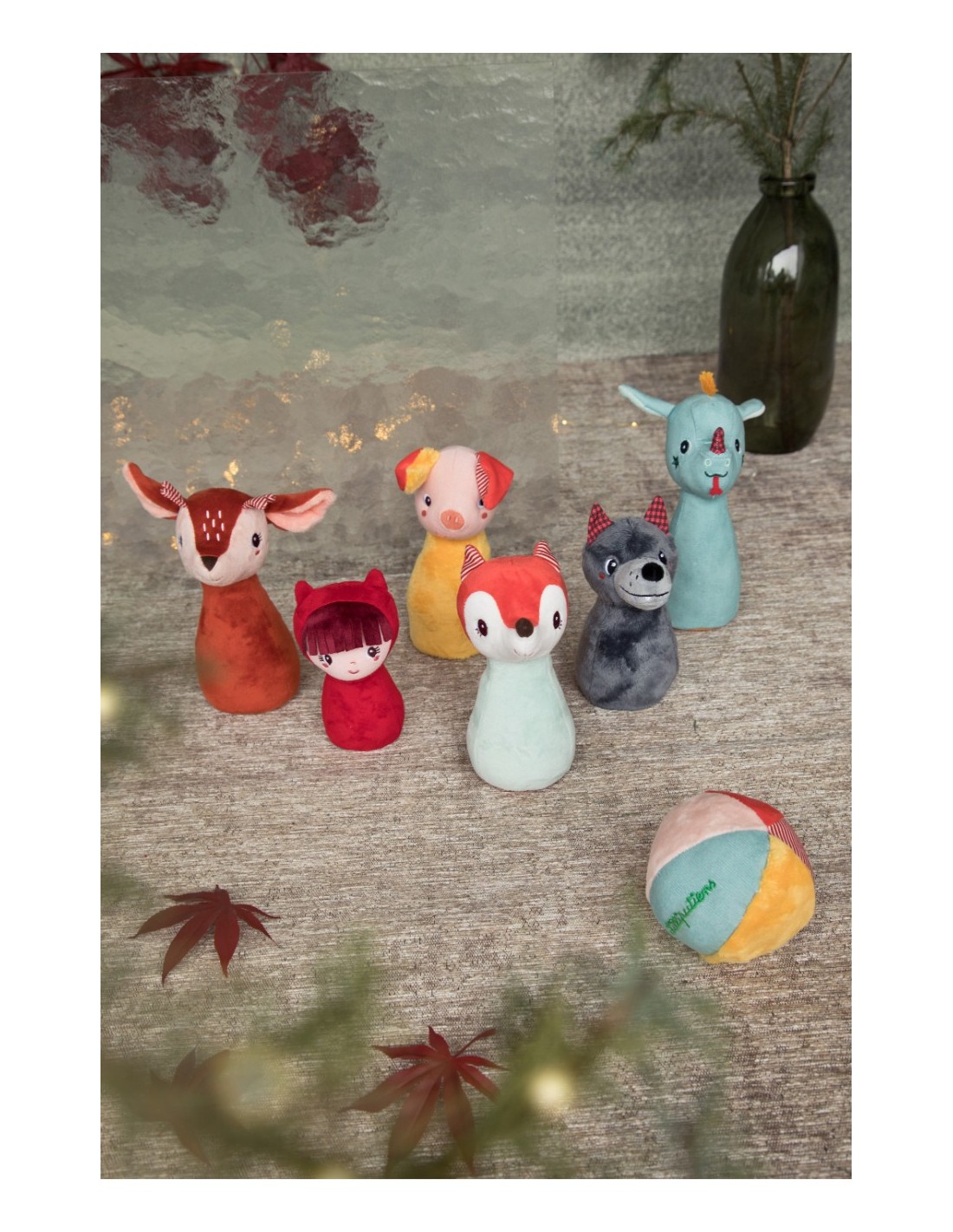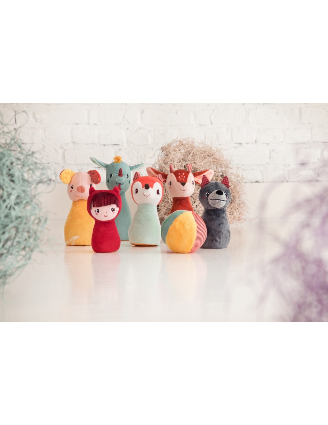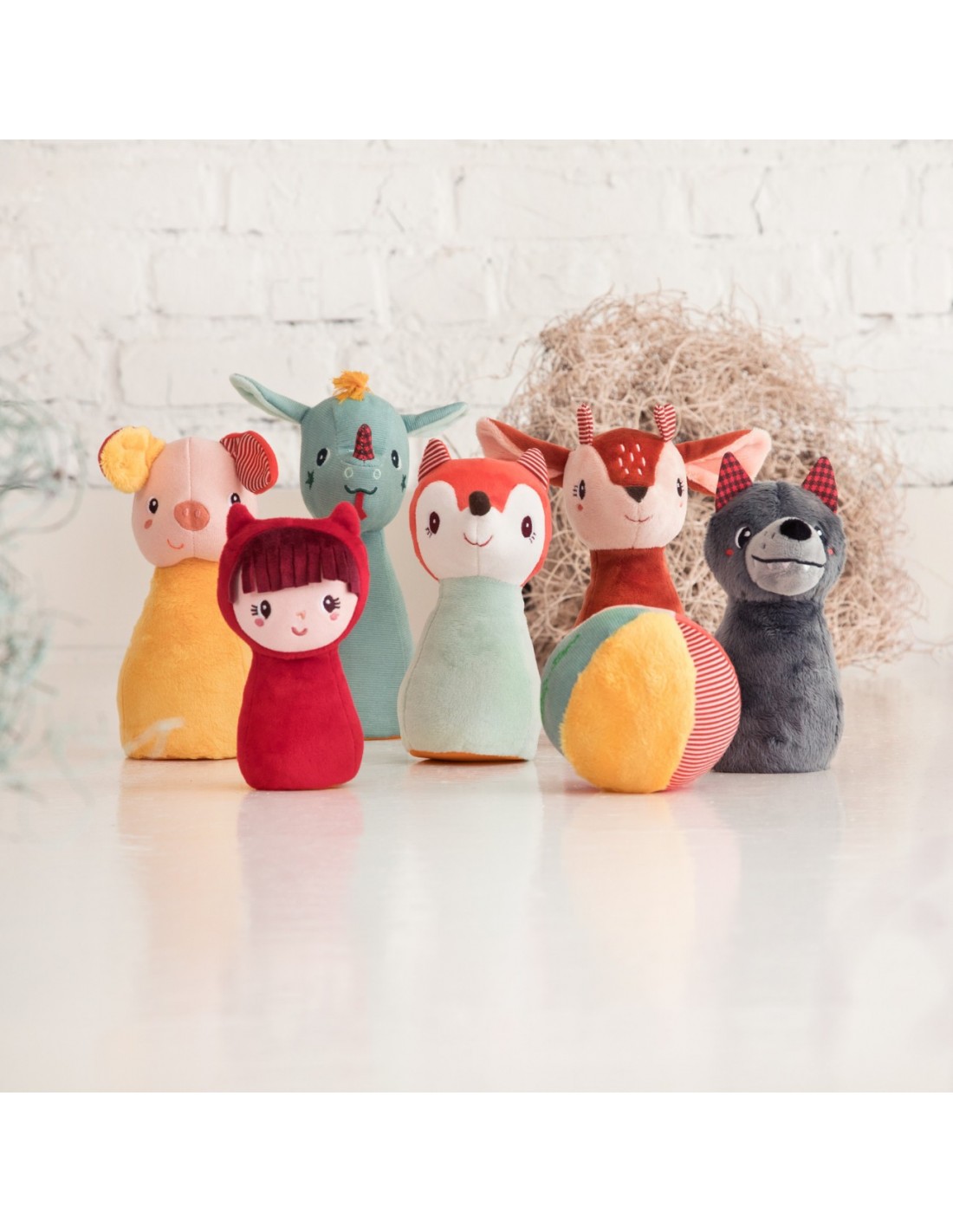 Divertido juego de bolos, cada uno de ellos representados por un adorable personaje de cuento. Blanditos y suaves, para jugar en casa sin dañar nada.