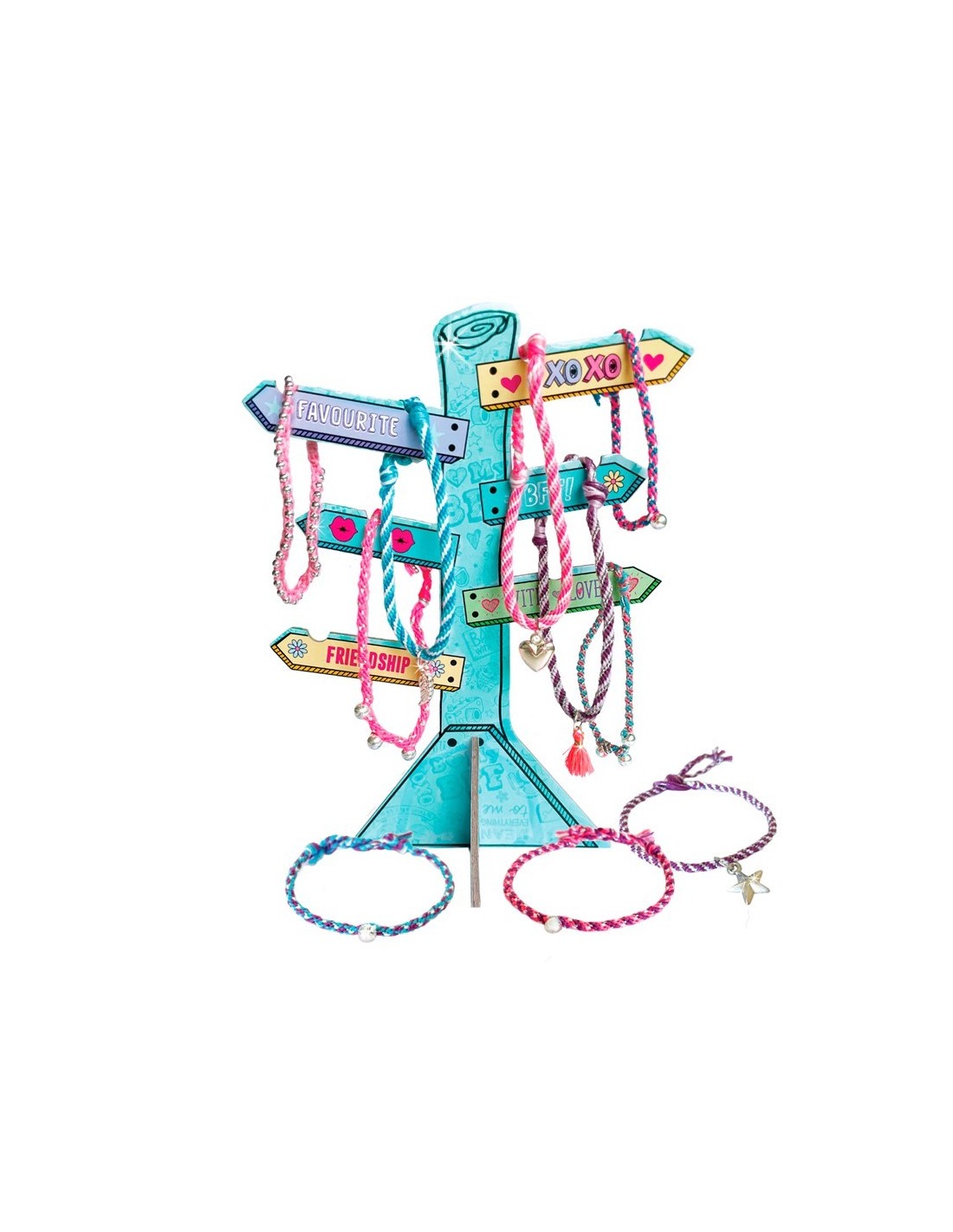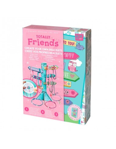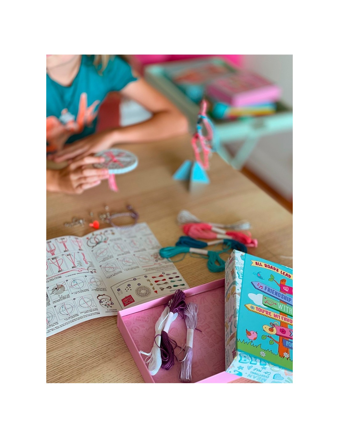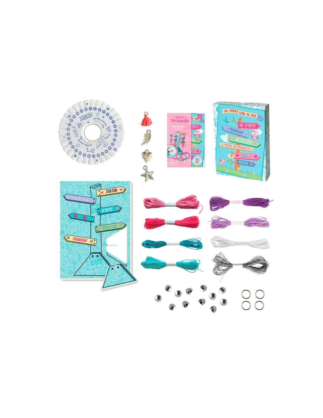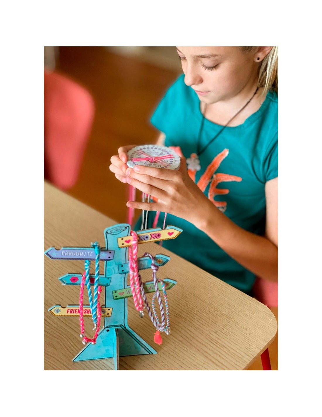 Contiene cartón para recortar y crear el soporte para las pulseras, 8 bobinas de hilo en diferentes colores, abalorios para decorar tus pulseras y un medidor. Instrucciones en el interior de la caja.