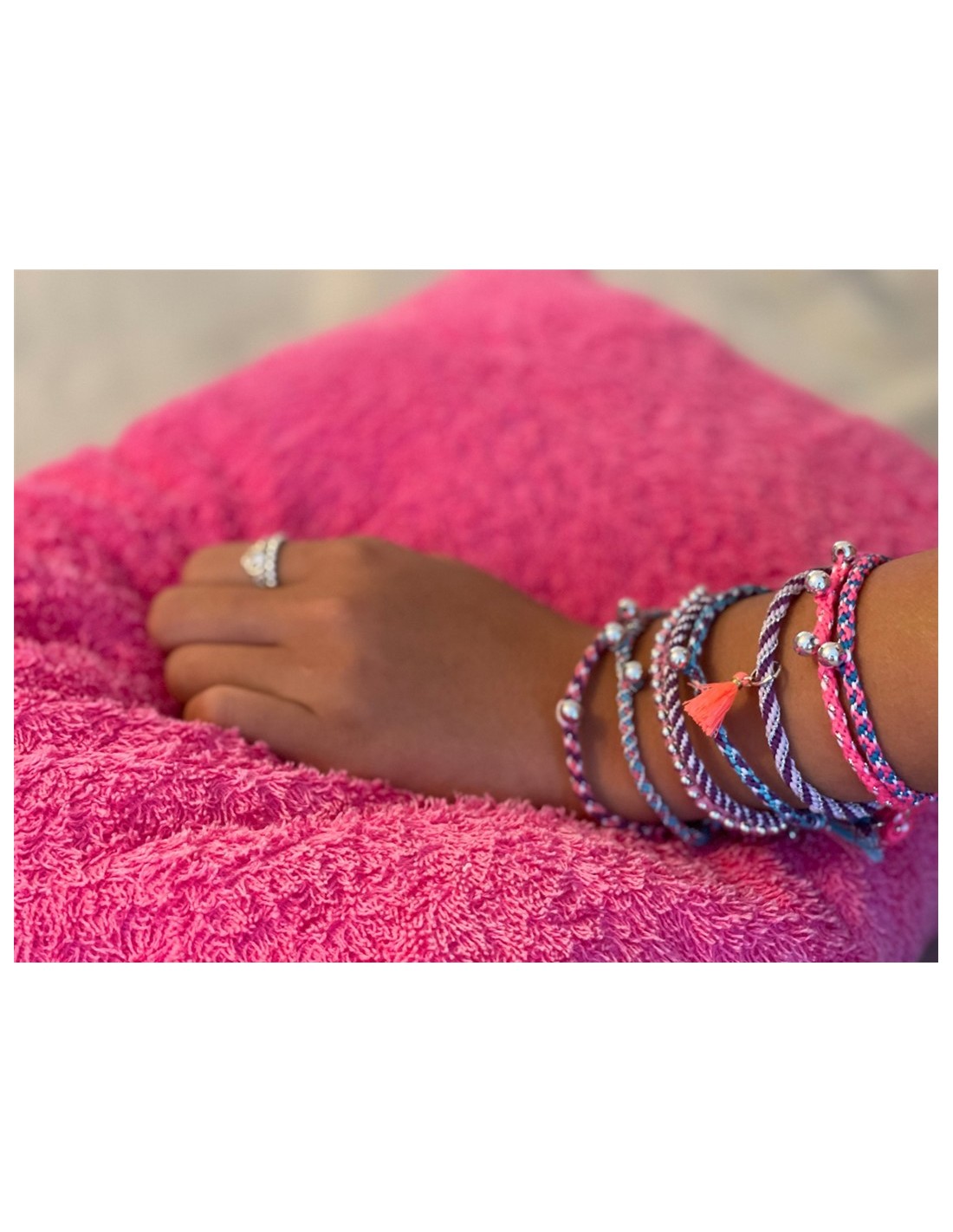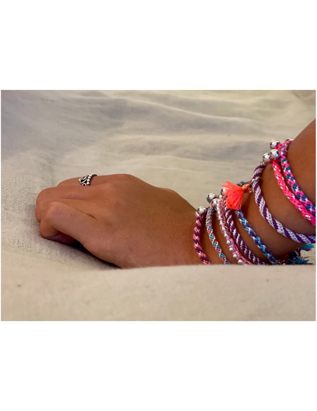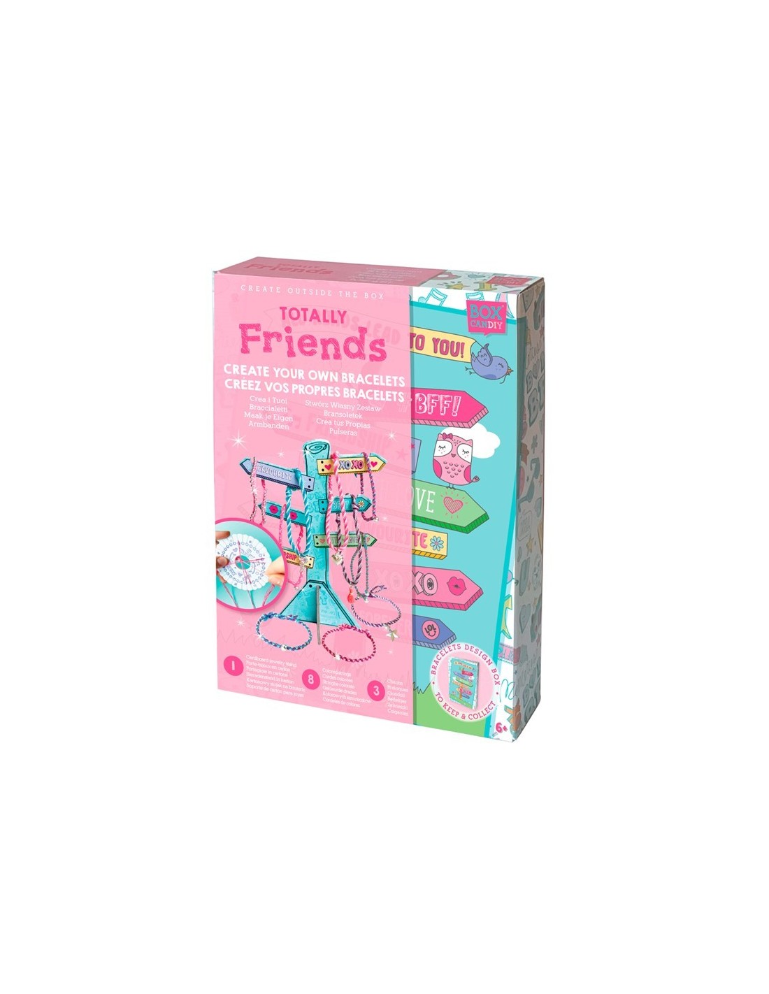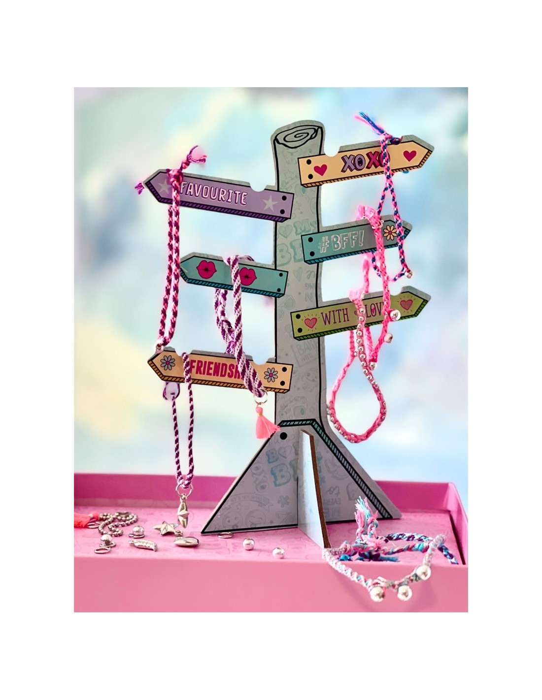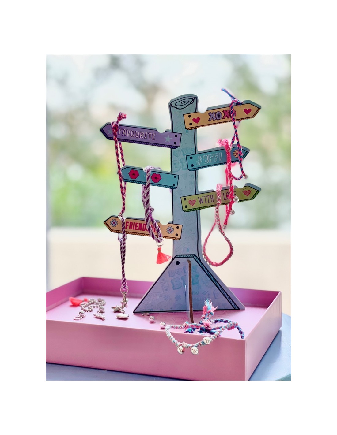 Contiene cartón para recortar y crear el soporte para las pulseras, 8 bobinas de hilo en diferentes colores, abalorios para decorar tus pulseras y un medidor. Instrucciones en el interior de la caja.