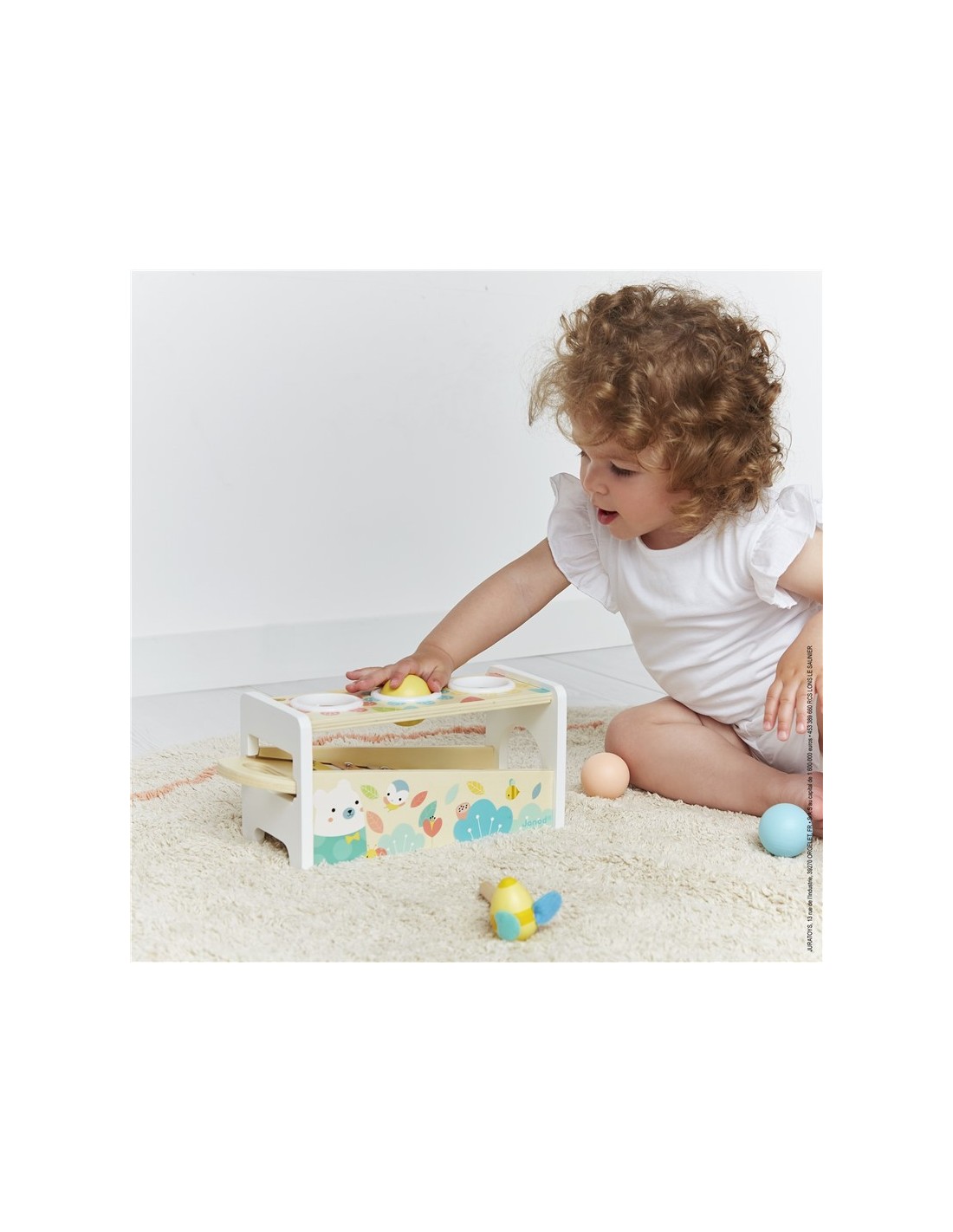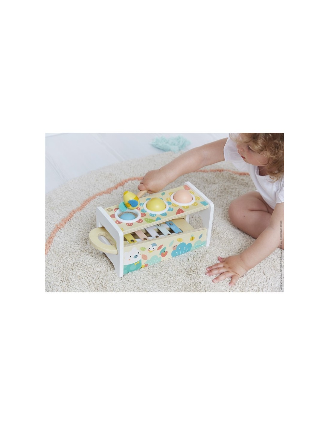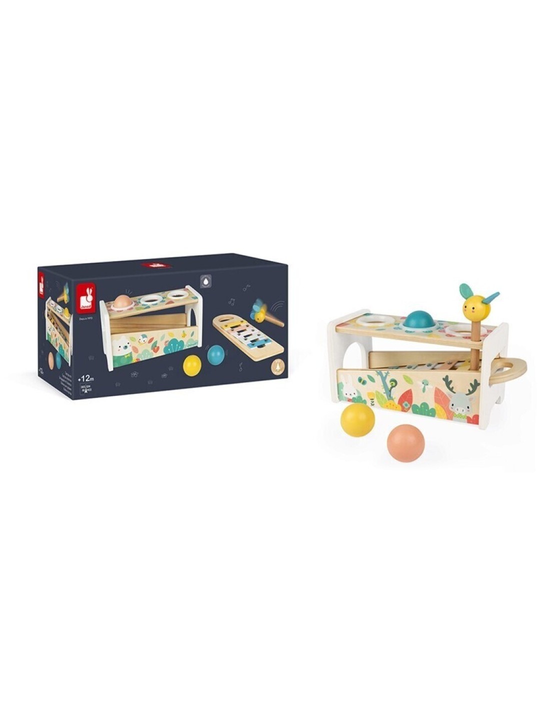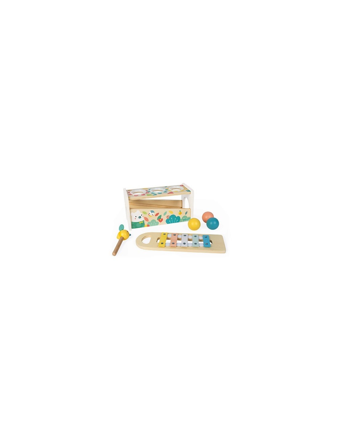 Un bonito juego de habilidad en tonos muy suaves y actuales con encantadores animalitos que permitirá a su hijo desarrollar su destreza mientras se divierte. ¡2 juegos en 1: un mazo de abeja para golpear las 3 bolas que caen haciendo sonar las teclas del xilófono y un xilófono desmontable para poder jugar en cualquier lugar!