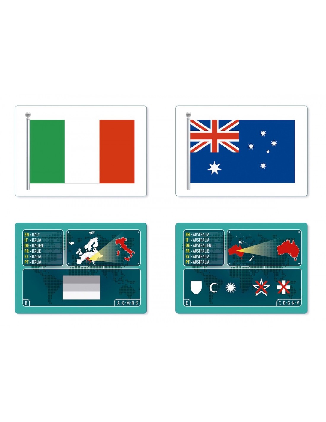 - Cartas ilustradas con banderas y datos de países